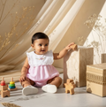 A sweet, classic romper crafted out of elegant seersucker fabric with an elegantly embroidered collar having frill details. A classic beauty!